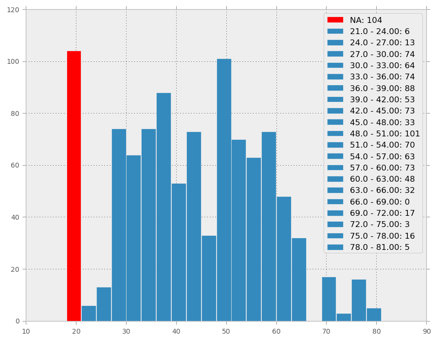 For D3 I follow the main histogram example and added a red column to show missing values and hard-code it a little bit more to make changes easier.