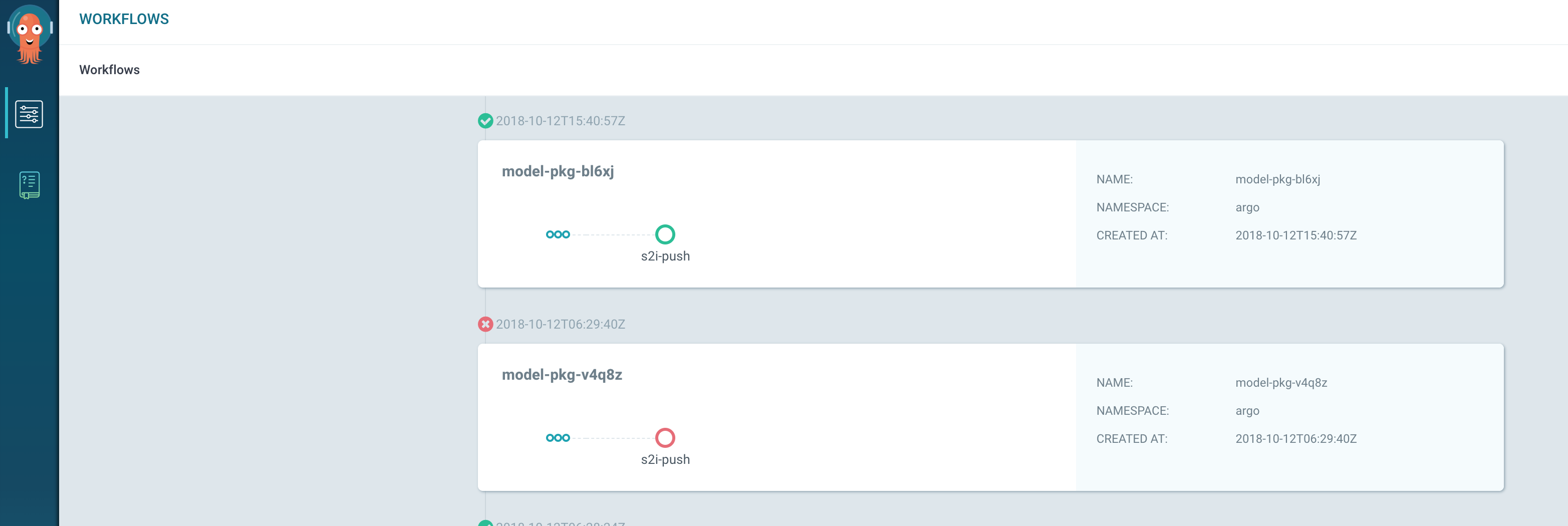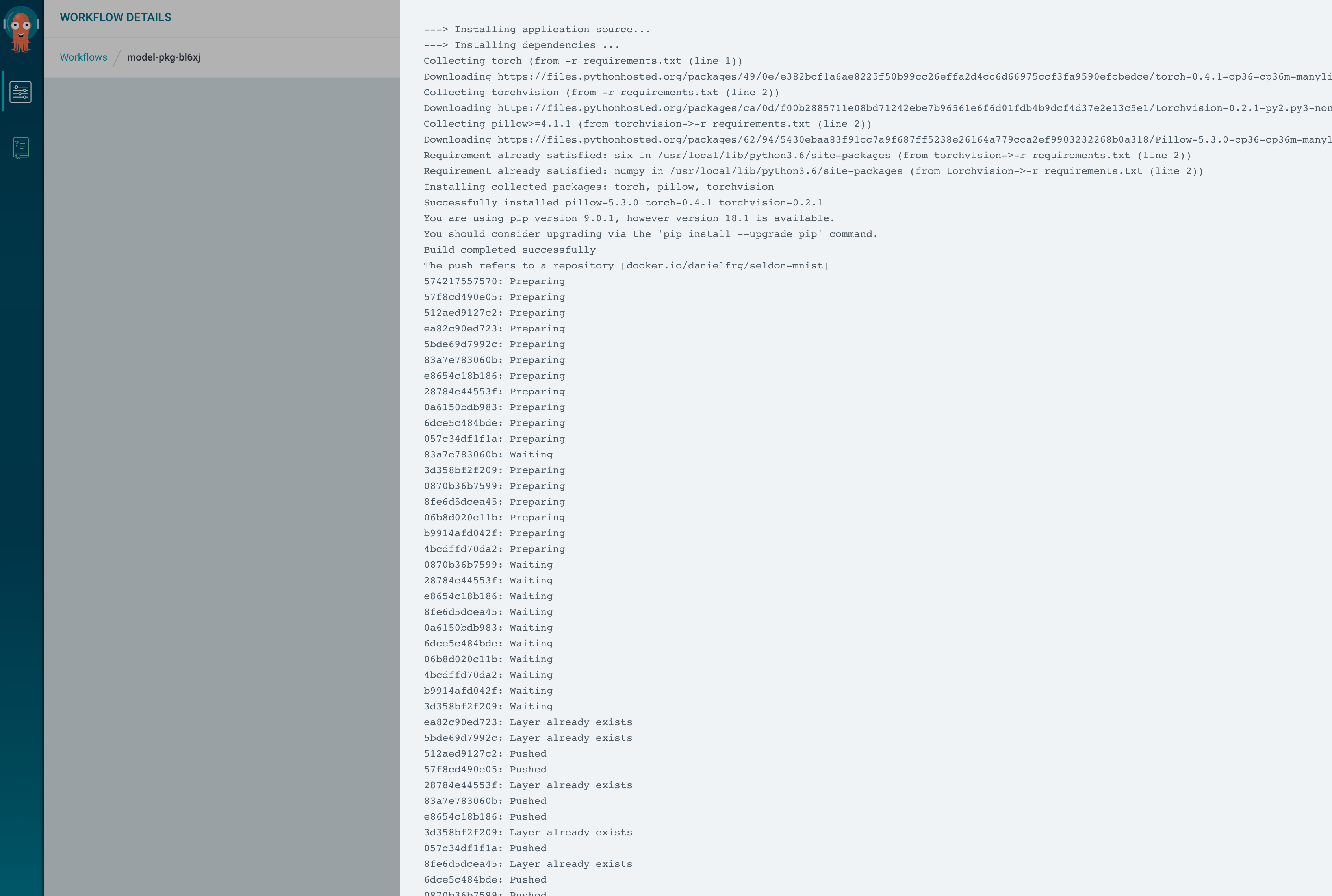 The pipeline uses s2i with the base Seldon image seldonio/seldon-core-s2i-python3, builds an image tagged danielfrg/seldon-mnist:0.2 and push that new image to Docker hub. Argo will handle all the execution and you can see logs and more in their UI: