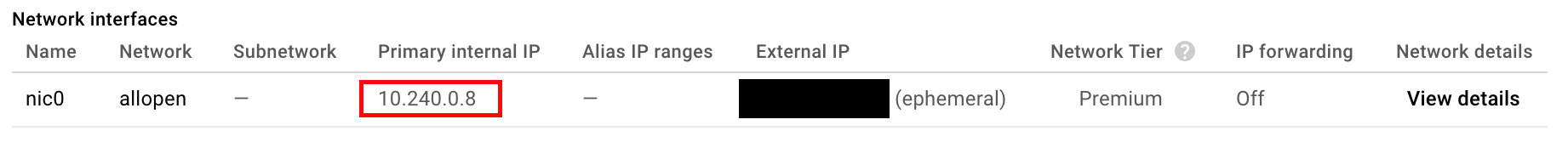 Get the (private) IP of the NFS server either with the command below or just search for it on the Google Cloud console in the VMs. In my case 10.240.0.8.