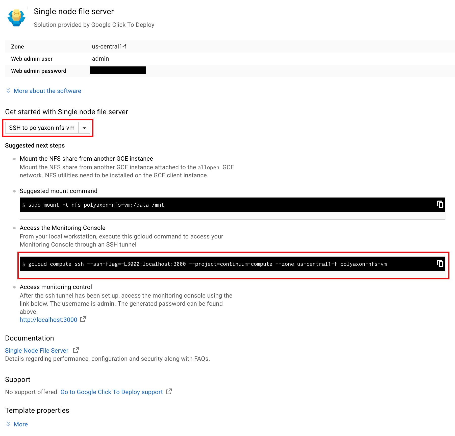 We need to create a couple of directories in the NFS server, so SSH into the node by copying the command available in the post install screen or just clicking the “SSH to …” button.