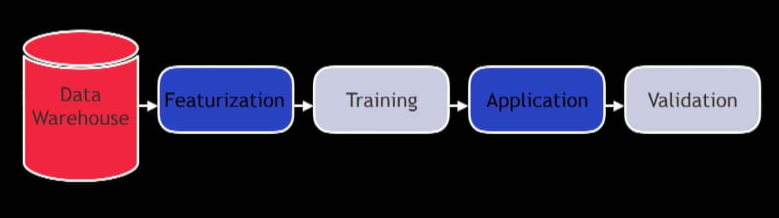 Process/Lifecycle: Data Warehouse -> Featurization/Transformation -> Training (Produce a model) -> Application (take weights and probabilities and generating an output) -> Validation.