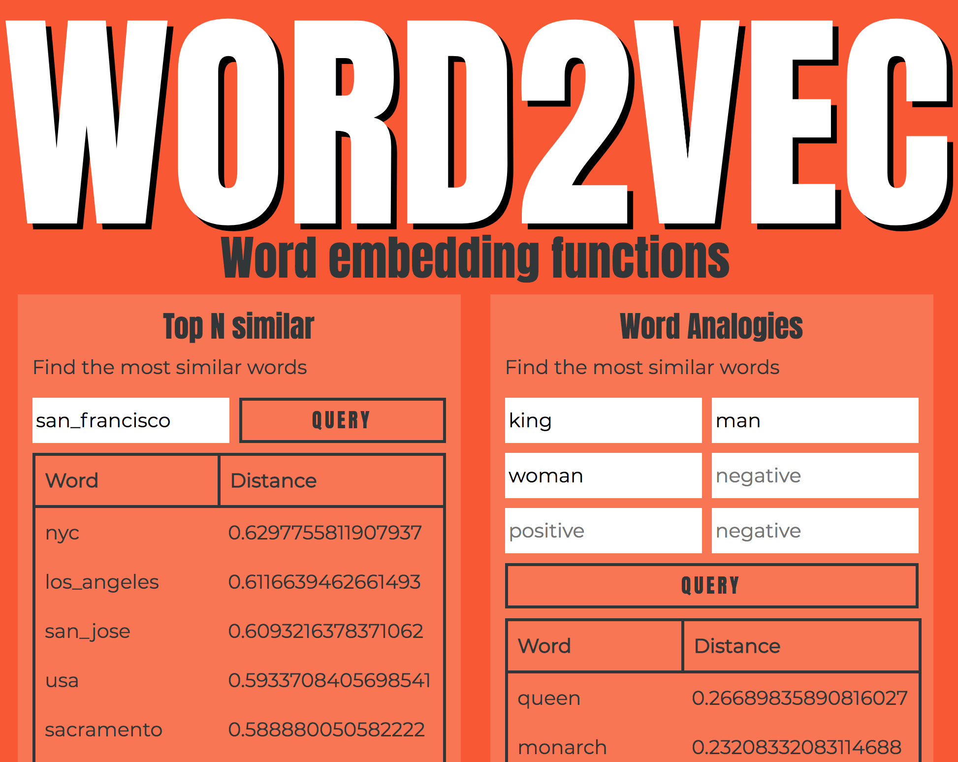 You can find the app at word2vec.danielfrg.com. It allows you to do some simple queries for word similariy and analogies and it looks like this: